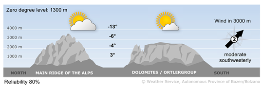 Thursday will bring lots of clouds and some precipitation, mostly in the south-facing slopes. The snow line will be between 400 and 800 m. Friday will continue to be very cloudy. While cold northerly föhn winds will dry the air in the valleys, it may snow at times at higher altitudes. Saturday a mix of sun and clouds. Light snowfall is possible in the Dolomites. On Sunday, the weather is likely to be sunny. In the valleys, the Föhn will subside.