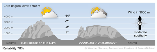 Low-lying clouds will restrict visibility, especially in the southern mountain ranges. Towards the north, sunny spells are possible during the day, the longest in the Vinschgau Valley.