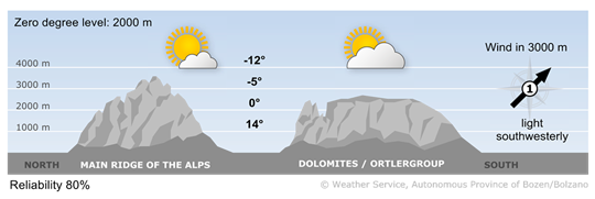 Saturday will bring lots of clouds again, with some rain in some areas during the day. On Sunday, sunny spells will alternate with thicker clouds and isolated showers will form. Light precipitation is possible on Monday morning, but the clouds will then break up and it will become quite sunny. There will be foehn winds, especially in Vinschgau and Wipptal. Tuesday will be mostly sunny, with thicker clouds at times on the main Alpine ridge. Foehn winds will continue.