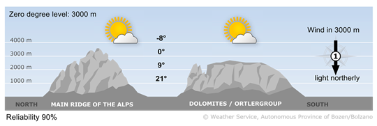The sun will shine frequently in South Tyrol. A few cumulus clouds will form during the day, and isolated showers are possible, particularly along the border with North Tyrol and in the Dolomites.