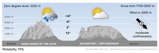 The sun will shine from morning till evening from a largely cloudless sky. Northerly wind will continue to blow in the villages near the main Alpine ridge.