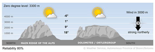 The sun will shine across the region, with a few harmless cumulus clouds forming towards the south. Föhn winds will be blowing in the northern valleys.