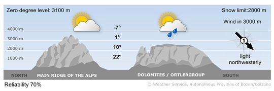 Conditions in the mountains will be sunny and very mild. It will be mostly clear tin the morning, high cloud fields will move in during the afternoon and become thicker towards evening. The freezing level will be at 3000 m during the day.