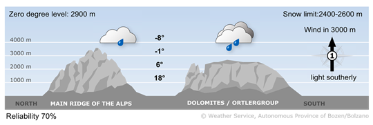 Sunshine will prevail in the mountains this morning. In the afternoon, some cumulus clouds will develop and a few showers may form, particularly in the Dolomites.